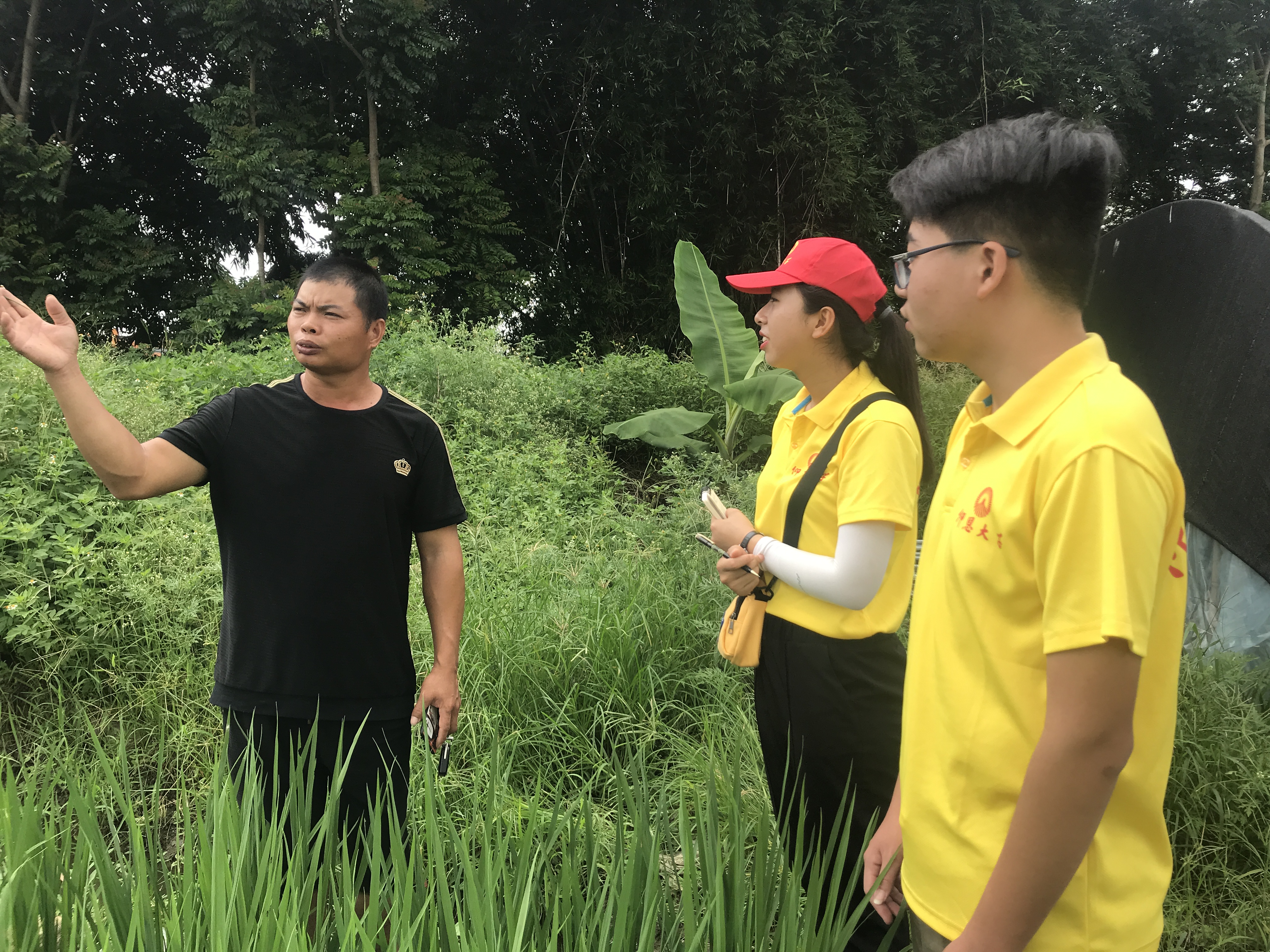 图1:沈乾宗先生向实践队介绍富硒大米 湖内村以富硒农产品著名,其中富硒大米是湖内村主要农产品。在湖内村村干部沈乾宗先生的带领下,实践队成员们参观了水稻种植地、大棚蔬菜种植地等地。沈先生向实践队介绍了湖内村富硒大米的营养价值、收成周期、产量、种植技巧以及销售途径。除此之外,实践队成员们还到水稻种植地帮助农民干农活,亲身体验劳动。