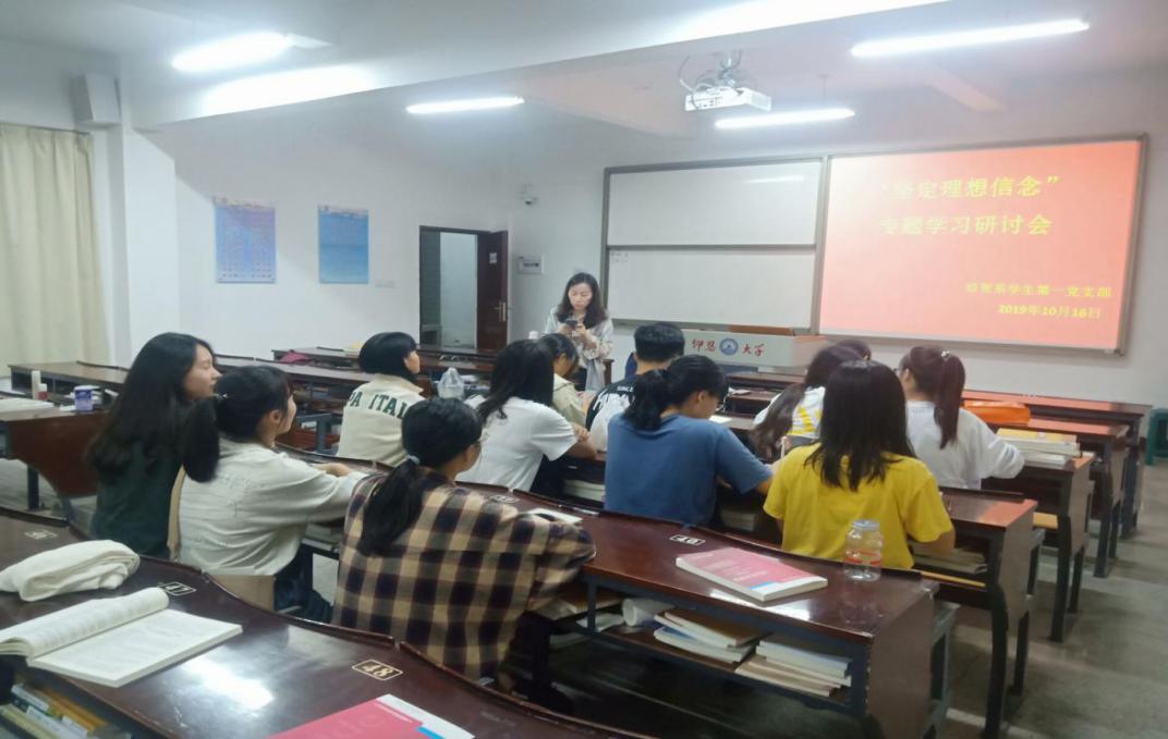 2019年10月16日,经贸系学生第一党支部于仰恩楼A1-109召开“坚定理想信念”专题研讨会,由支部宣传委员邹琴老师主持会议,支部书记林丽华老师、组织委员吴惠明老师及经贸系学生会第一党支部全体学生党员出席本次学习会议。