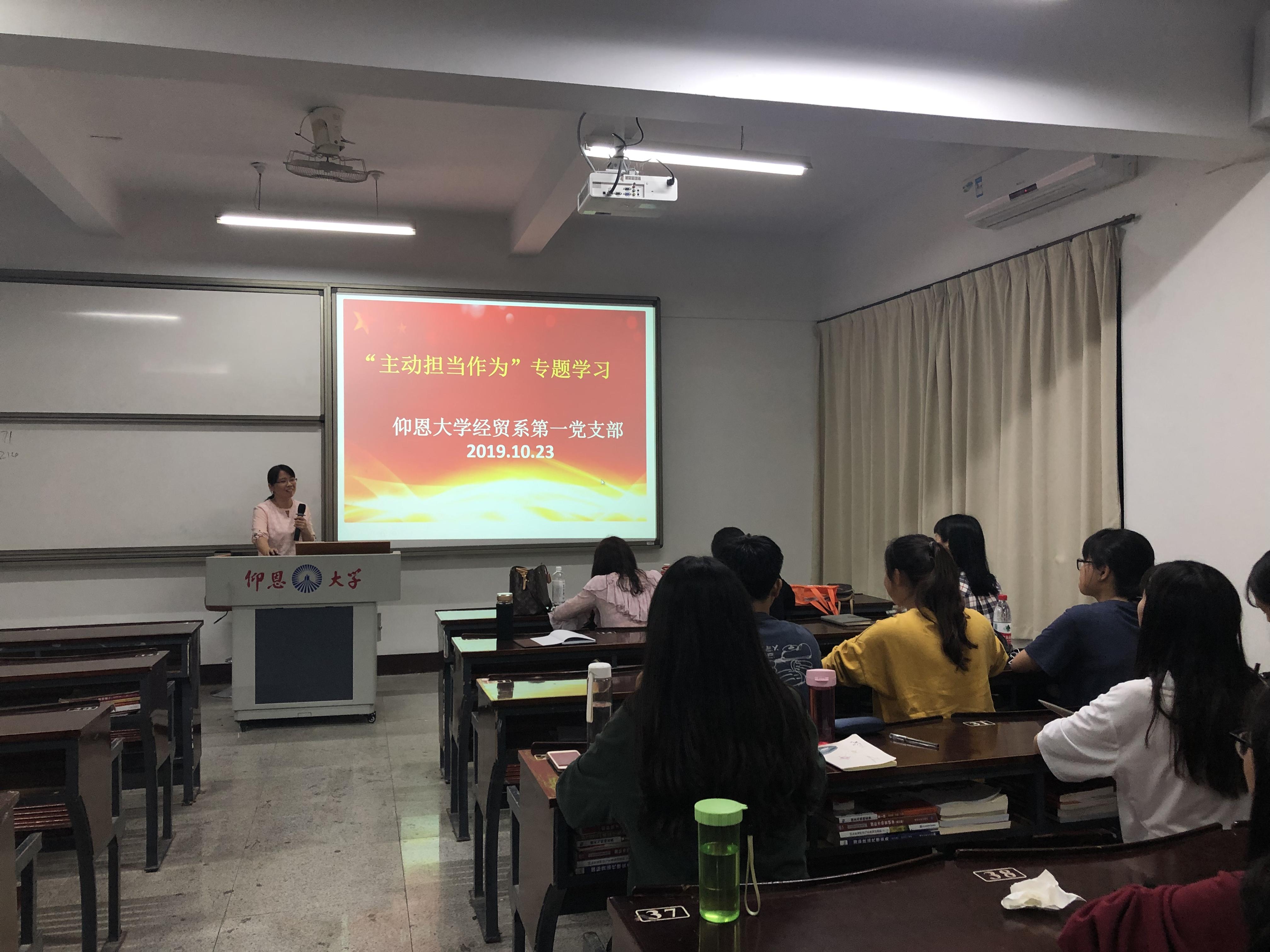 10月23日,经贸系学生第一党支部于仰恩楼A1-109召开“主动担当作为”专题学习会,支部书记林丽华、组织委员吴惠明、宣传委员邹琴及全体支部党员出席本次会议。