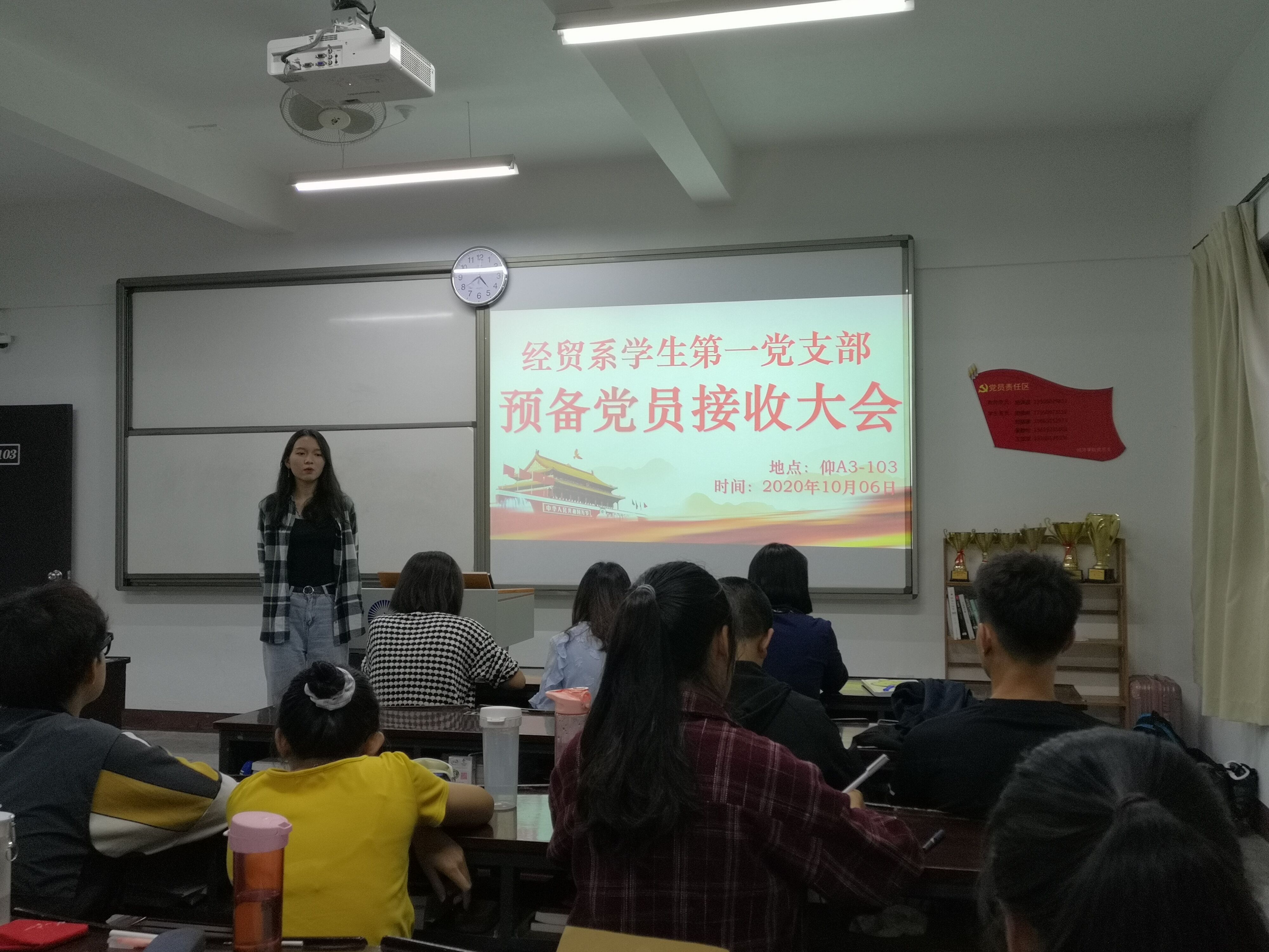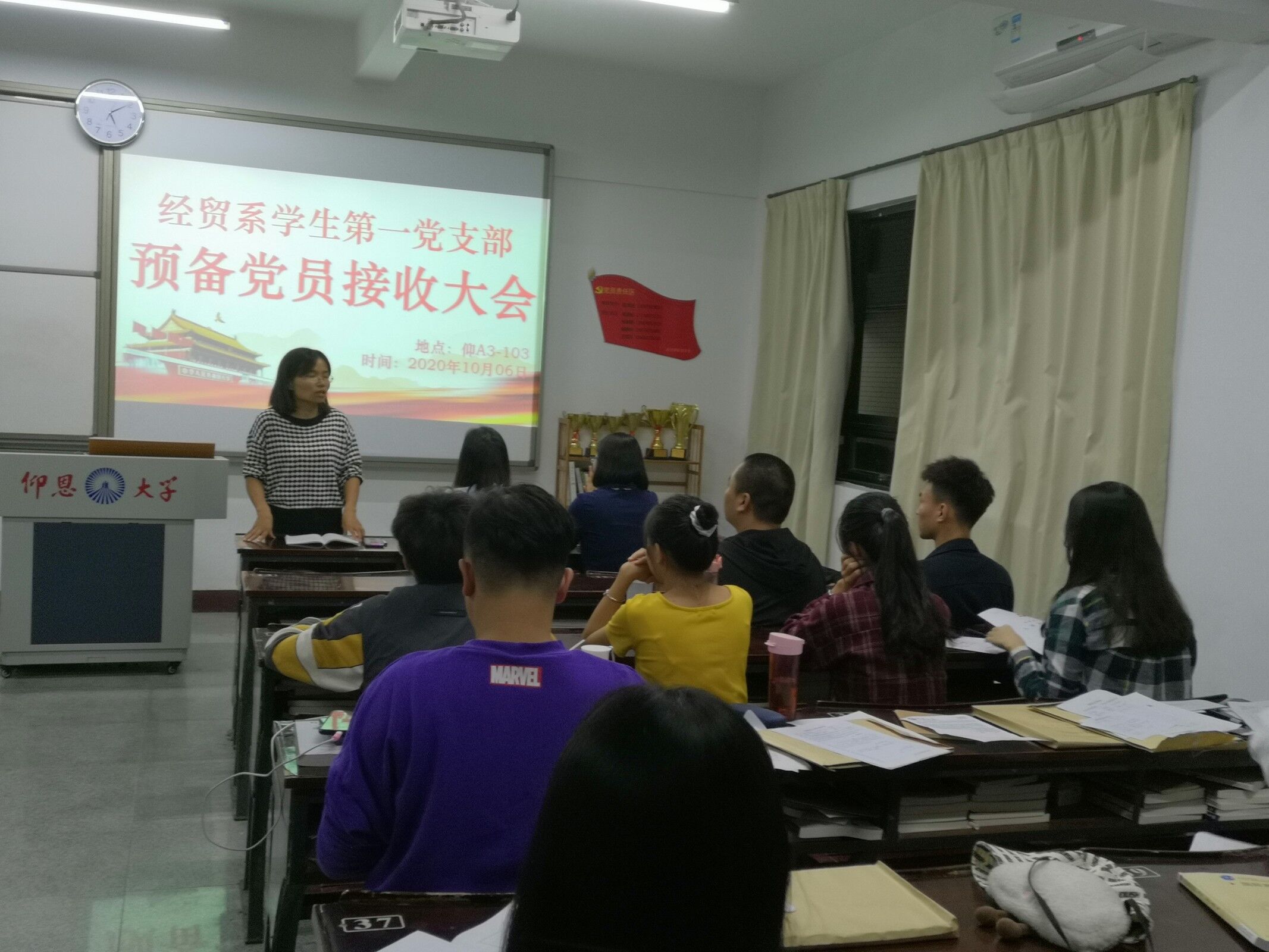 为响应党的号召,吸收优秀同学,beat365vip官网登录入口经贸系学生第一党支部于2020年10月6日在仰恩楼A3-103召开中共预备党员接收大会,本次会议共有10名党员出席,由支部书记林丽华主持。