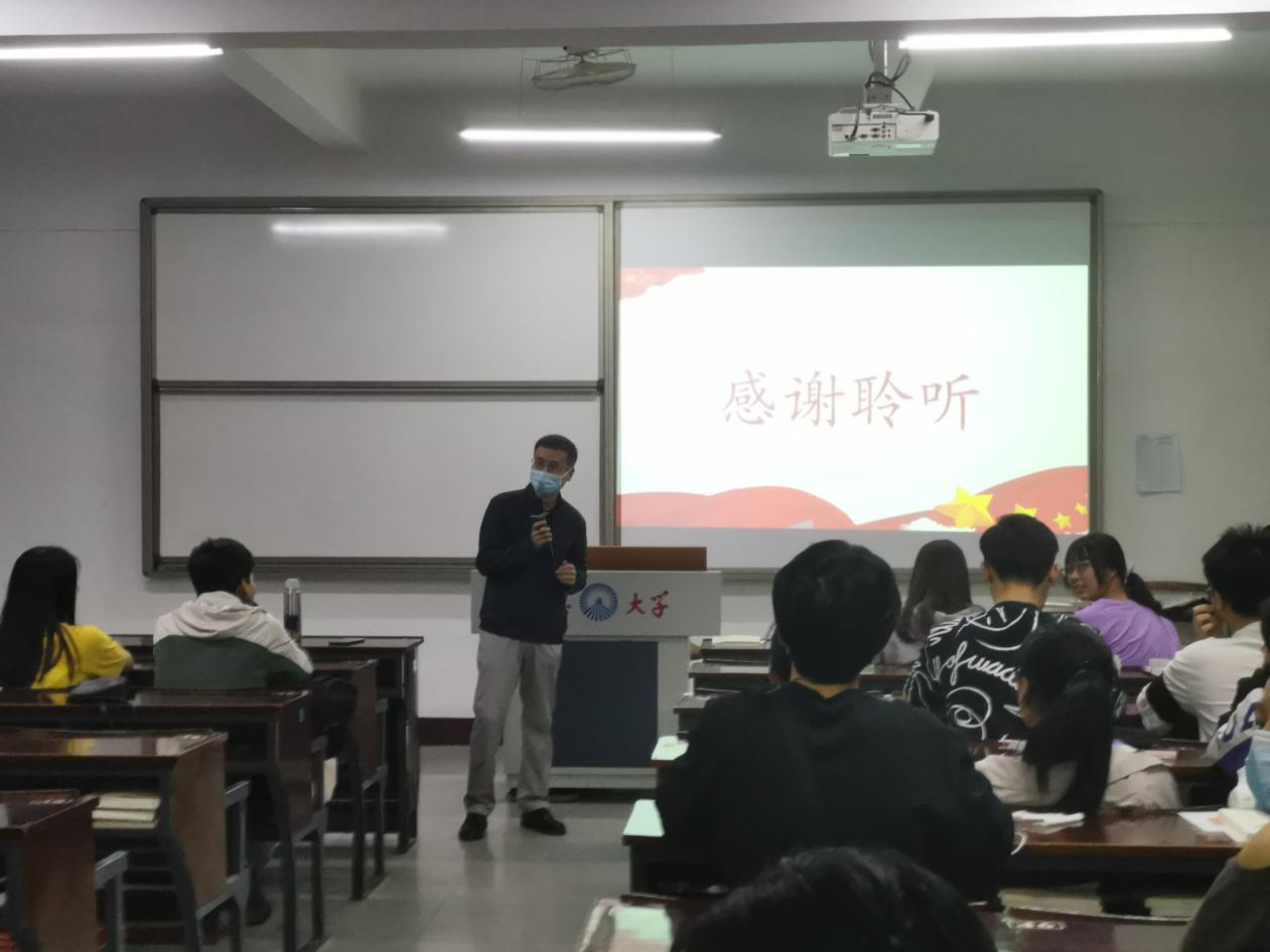 图2 组织委员仲平老师在发言 会议尾声,组织委员仲平老师对本次学习会进行了总结发言,学习中国共产党人的精神谱系十分重要,作为学生党员和入党积极分子更加应该重视自己思想的提高,时刻保持自身的先进性,努力学习党史文化。