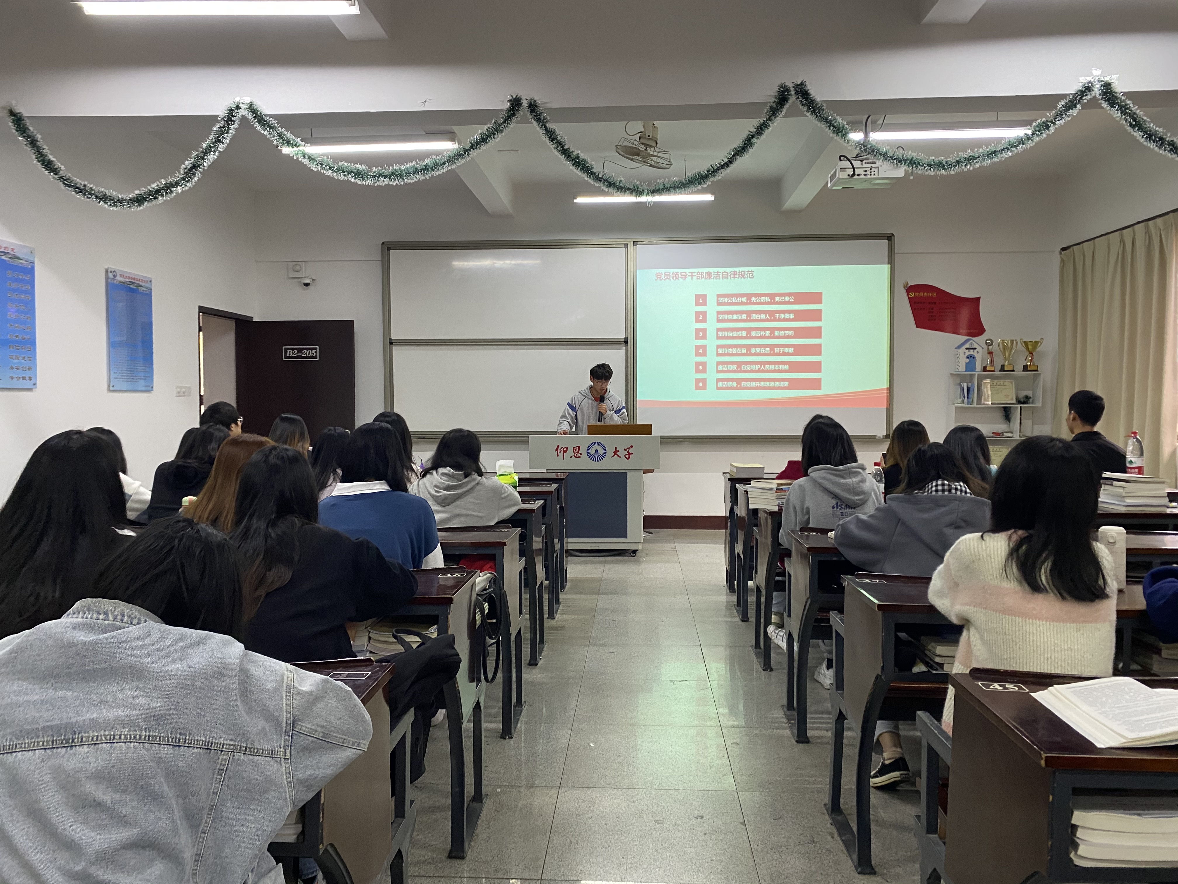 图2 讲解廉洁自律准则 学习党章党规觉纪,其次要了解党规党纪的主要内容。一是《中国共产党章程》。目前,我们党已形成了包括政治纪律、组织纪律、经济工作纪律、群众工作纪律在内的比较完整的纪律体系。各支部立足于《党章》,重新认识党员的义务和权利,强化对党的组织制度的归属感,强调基层党组织的战斗堡垒作用,深化对党的纪律的学习和理解,维护党章权威,把党规党纪铭记于心。二是具体的党纪党规,通过解读法纪内涵,将精神实质领会于脑。通过学习《中国共产党纪律处分条例》,强化政治纪律、组织纪律、廉洁纪律、群众纪律、工作纪律和生活纪律等意识,了解相关处分条例。在重点学习《中共共产党党内监督条例》中,了解党内监督主要内容,强调要遵党章、守党规,坚定理想信念,坚守共产党员的初心,践行党的宗旨,牢记党的使命担当,严肃党的纪律,推进党风建设,加强作风建设,严格落实从严治党,将中央八项精神落到实处。在学习中进一步领悟《中共共产党党内监督条例》的实行,对于坚持党要管党、从严治党的方针,发展党内民主,加强党内监督,维护党的团结统一,保持党的先进性,始终做到立党为公、执政为民,将起到重要作用及意义。最后,通过分析中央纪委国家监委公开通报六起违反中央八项规定精神典型问题,和福建省纪委监委通报4起群众身边腐败和不正之风问题典型案例,以人为镜,以史为鉴,强调《中国共产党廉洁自律准则》,强调作为共产党员必须坚守的“四个坚持”,作为党员干部必须做到的“四个廉洁、四个自觉”。