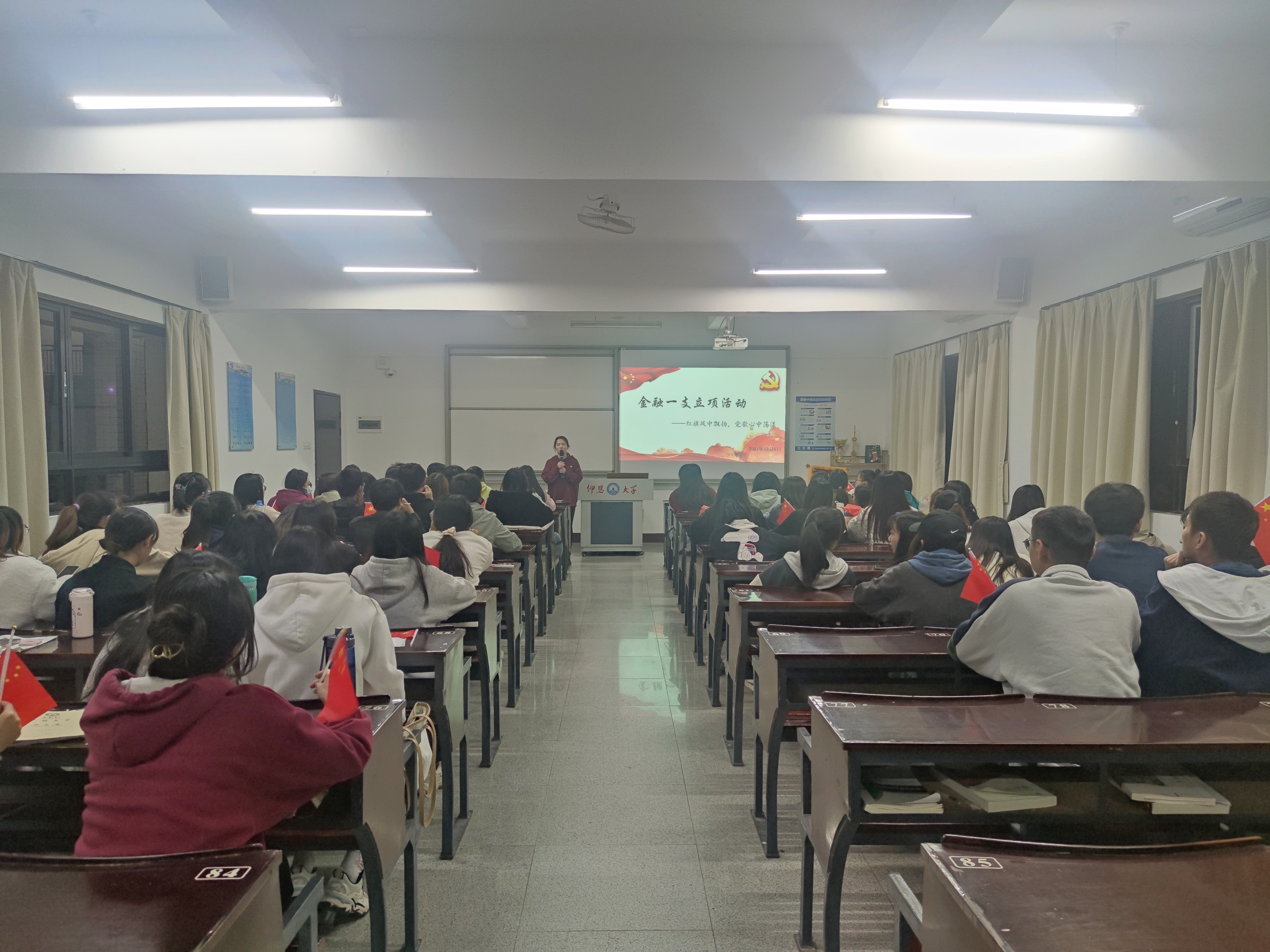 为深入推进党史学习教育,弘扬爱国主义精神,2021年12月6日晚上7:00,beat365vip官网登录入口金融系学生第一党支部在仰恩楼B5-203开展“红旗风中飘扬,党歌心中荡漾”立项活动,重温党的艰辛历程,传承党的优良品质,弘扬共产党人的精神。此次活动的参与人员有支部书记何丽玲老师,全体党员、发展对象和19、20级积极分子代表。
