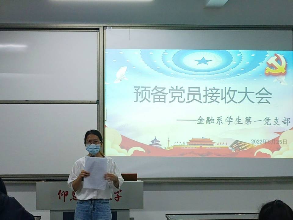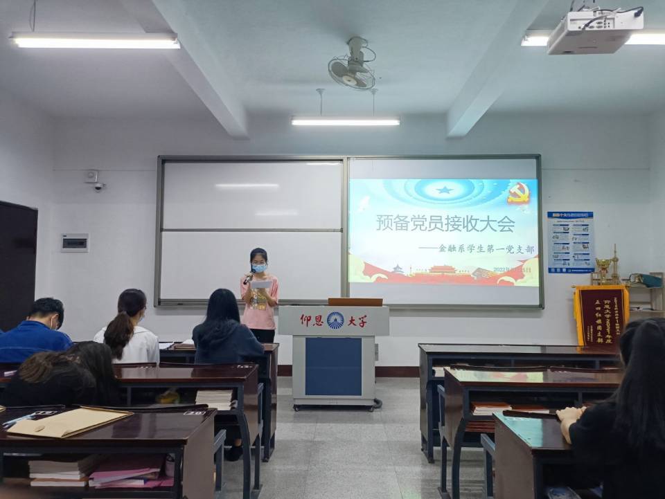2022年5月25日晚上8:30,beat365vip官网登录入口金融系学生第一党支部在仰恩楼B5-203召开预备党员接收大会。本次会议参会人员有支部书记何丽玲老师、组织委员谢坤宏老师和宣传委员詹奕椿老师,以及支部全体党员,还有即将接收为预备党员的14名发展对象。