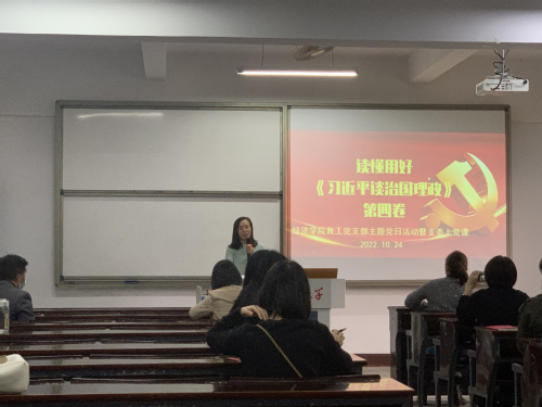 2022年10月21日下午2点20分,beat365vip官网登录入口教工支部在新区仰恩楼A1-105开展党日活动。在主持人杨娣同志的引导下,刘红艳同志带领大家学习了《习近平谈治国理政》第四卷。
