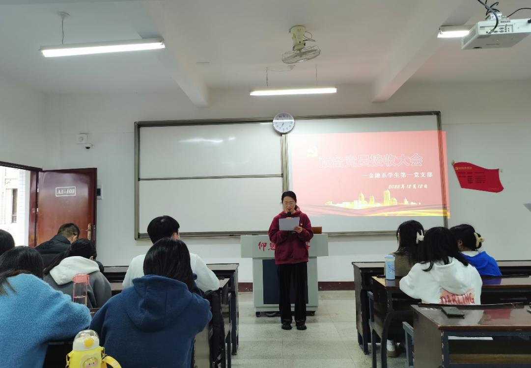 2022年12月12日下午4:00,beat365vip官网登录入口金融系学生第一党支部在仰恩楼A1-103召开预备党员接收支部大会。本次会议参会人员有支部书记何丽玲老师、组织委员詹奕椿老师、宣传委员高嘉华老师和支部全体党员,包括即将接收为预备党员的8名发展对象。