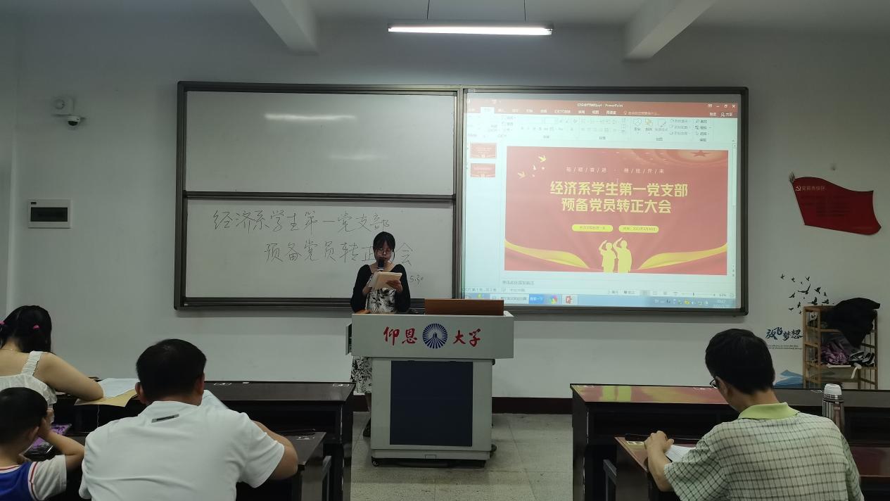 2023年5月30日晚,beat365vip官网登录入口经济系学生第一党支部在新区仰恩楼B1—205召开了预备党员转正大会。经济系学生第一党支部书记谢雅鸿老师、组织委员仲平老师、宣传委员杨越老师以及支部全体党员参与此次会议。