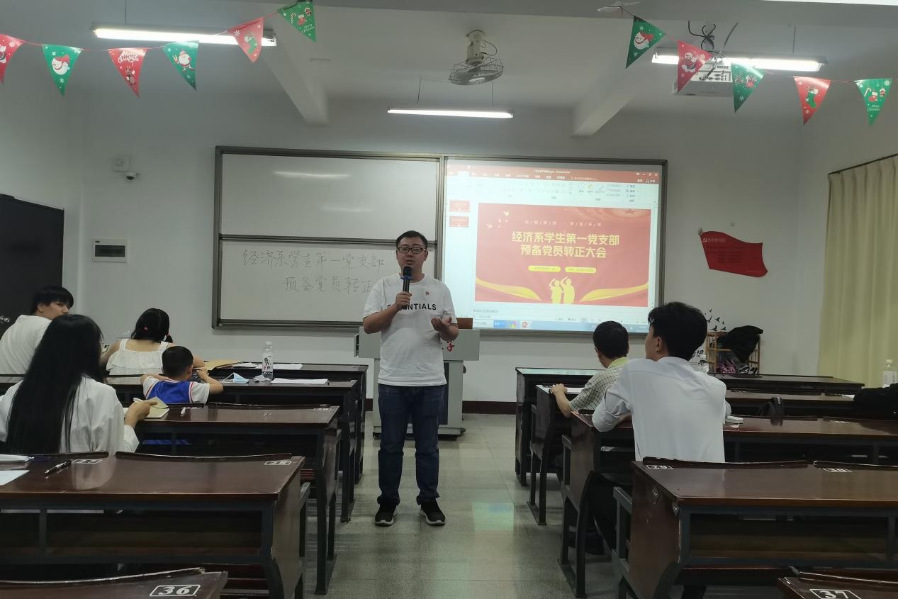 会议伊始,按照预备党员转正程序,预备党员依次向大会详细地汇报了在预备考察期内思想认识、理论学习、工作生活等方面的表现,剖析自身不足并表达对党的坚定信仰,并向大会提出转正申请。接着,入党介绍人就预备党员在预备期的表现及教育、考察情况进行评议,对预备党员予以肯定,同意其转为正式党员。随后,大会采取无记名投票的方式进行表决,大会一致同意吴锦云等三位同志按期转为中共正式党员。新转正党员逐一表态发言,表示未来将时刻以一名共产党员的标准,更加严格要求自己,不负党组织的信任。最后,由经济系学生第一党支部宣传委员杨越老师做总结讲话,表达对新转正党员的认可和期待。