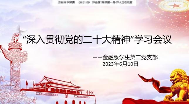 为进一步贯彻落实党的二十大精神、二十届中央纪委二次全会精神和习近平总书记关于加强纪律建设的重要论述,我院于2023年6月10日晚7点组织所有党员线上开展“学习党章党规党纪”专题活动,大力营造廉洁文化氛围,夯实党员们清正廉洁的思想根基,本次学习内容为《中国共产党章程》《中国共产党廉洁自律准则》等党章党规党纪,金融系学生第二党支部参加学习会议人数达69人。