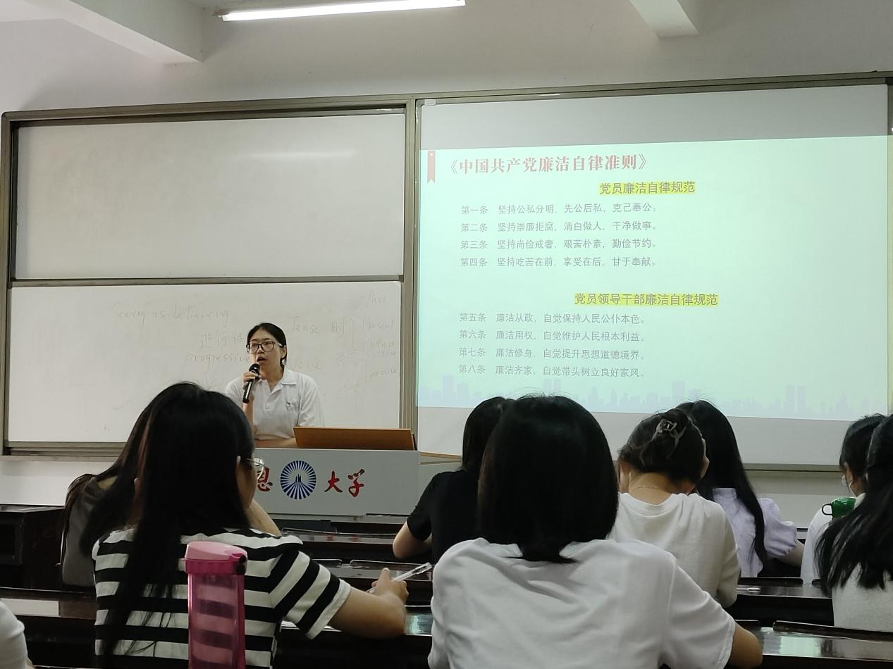 为学习贯彻习近平新时代中国特色社会主义思想主题教育,加强党员纪律精神建设,筑牢二十大根本,2023年6月12日,经贸系学生第一党支部在仰恩楼A3-103组织召开“书记好党课”活动,此次党课主题为“守纪律讲规矩做合格党员”学习会。