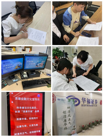 2.内外同频共建学廉倡廉好风尚。携手本地银行等金融机构共同深入当地重要规模性企业发放《廉洁从业告知书》,宣讲清廉金融文化,取得一次宣讲,辐射多人的效果。2022年9月以来累计开展15场活动,发放超近200份《廉洁从业告知书》;在各营业部柜台放置并主动向客户发放《廉洁从业告知书》,宣传“清廉华福”形象,获得客户认可;向员工家属发放《廉洁倡议书》,让廉洁企业文化带动廉洁家风建设,廉洁家风助力打造廉洁企业文化。