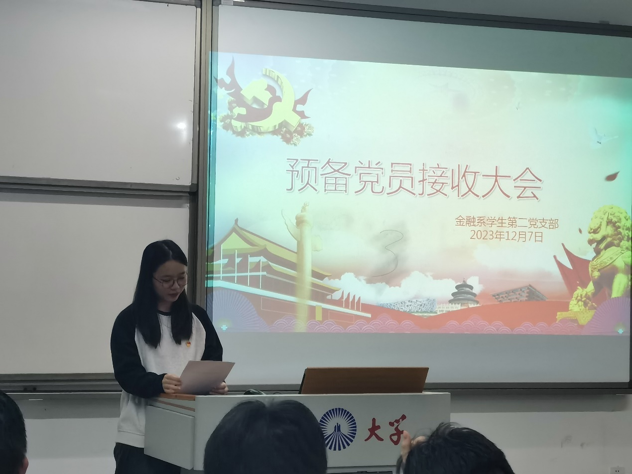 最后,由龚梦瑶书记对本次接收大会进行总结:对张锦霞等同志成为我支部预备党员表示祝贺,下一步要以合格党员的标准严格要求自己,加强学习,保持应有的工作热情努力服务群众,提高自身修养争取早日成为一名中共正式党员。(金融系学生第二党支部 陈晶晶/图文 审核:龚梦瑶)