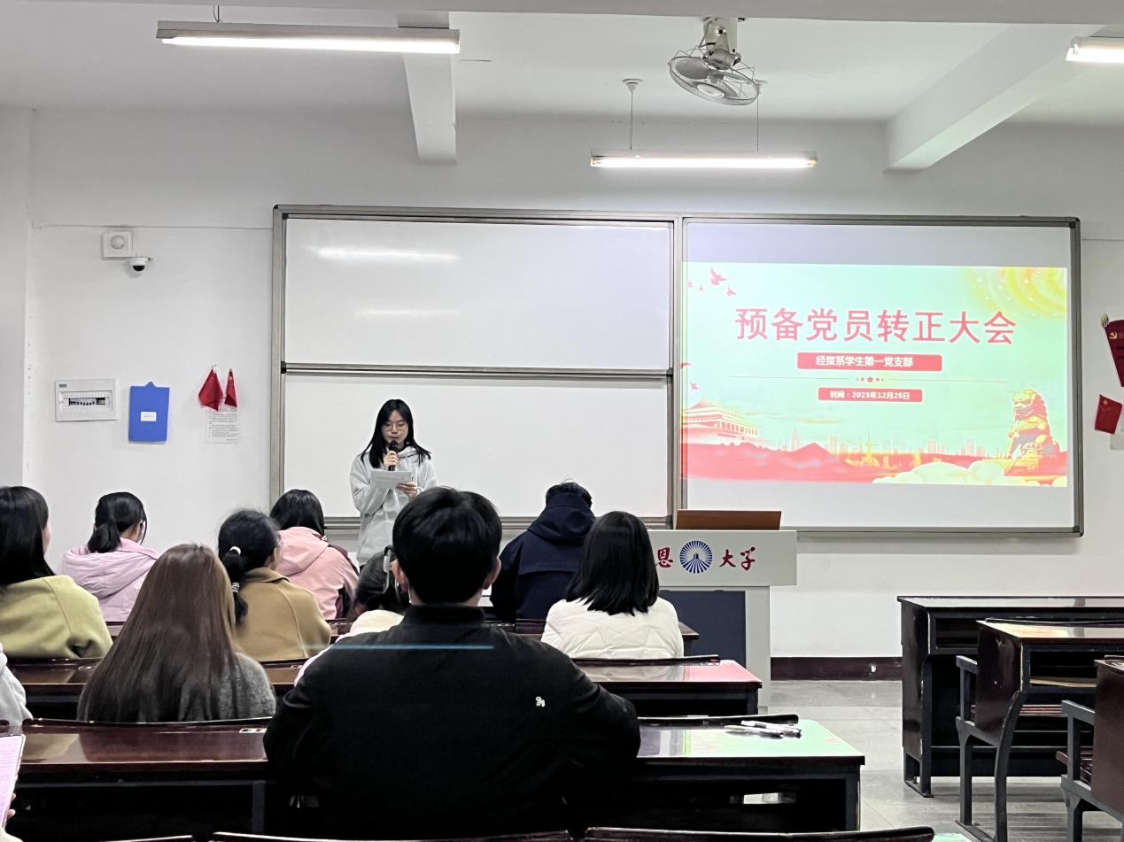 为严格落实发展党员要求,加强基层党组织建设,1225经贸系学生第一党支部召开党员大会,讨论表决陈梦菲三名预备党员转正事宜。本次党员大会支部书记黄培真主持,经贸系学生第一党支部全体党员出席会议。