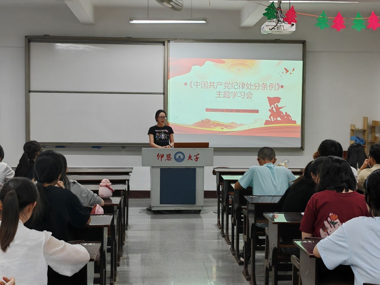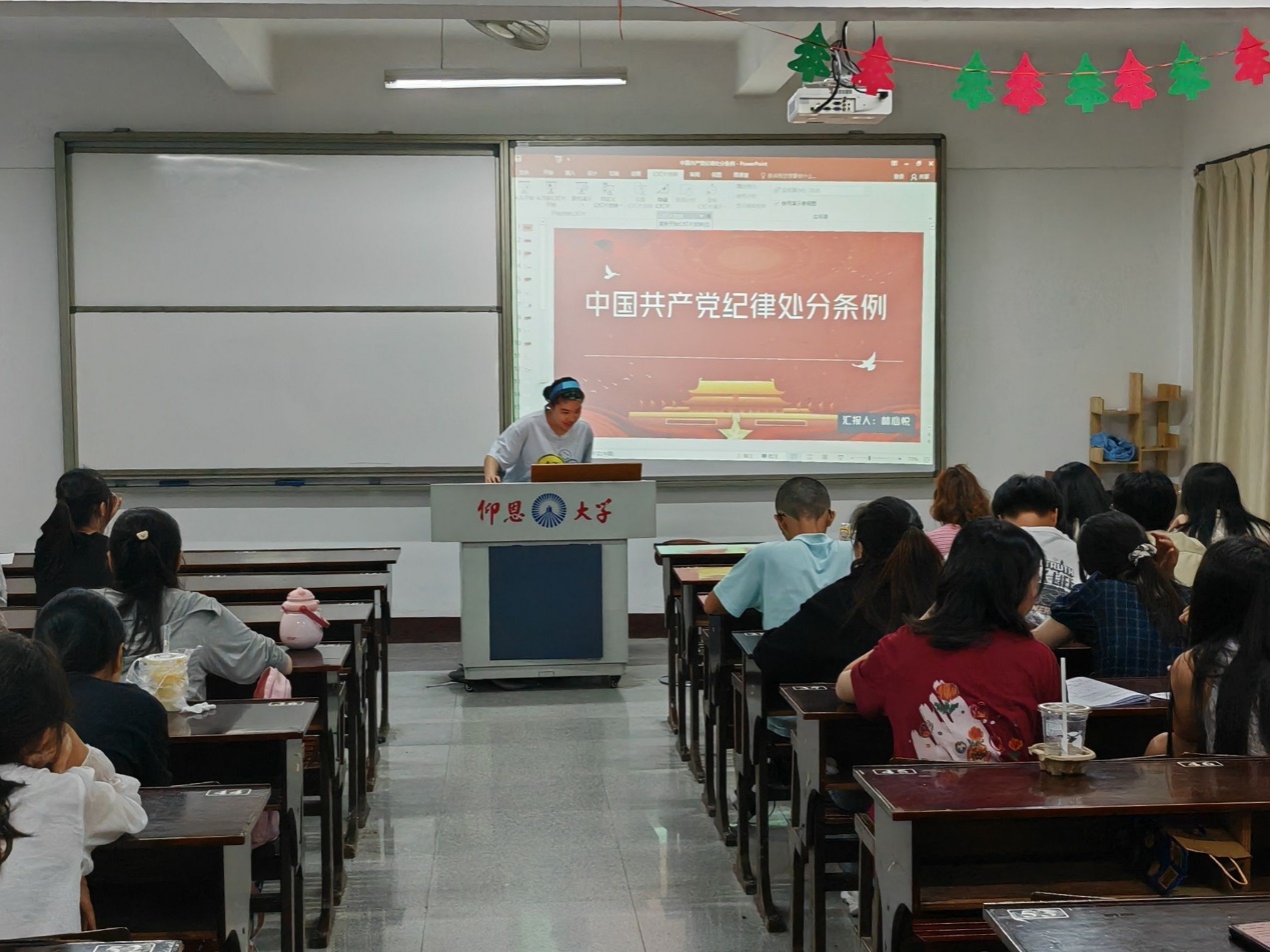 学习会伊始,先由支部干事周怡芯同志对《中国共产党纪律处分条例》进行了深入解读,详细介绍了条例的修订背景、主要内容和重要意义。接着,各班积极分子依次上台,以PPT形式分享了学习感悟。其中,林心悦同学还介绍了《中国共产党纪律处分条例》的 “五大亮点”以及“主要内容特点”,并结合实际工作进行了对自我的深刻反省与思考。