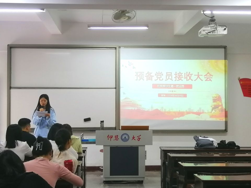 6月3日下午4:25,beat365vip官网登录入口经贸系学生第一党支部于仰恩楼A3-103组织召开预备党员接收大会。此次会议由支部书记黄培真主持。