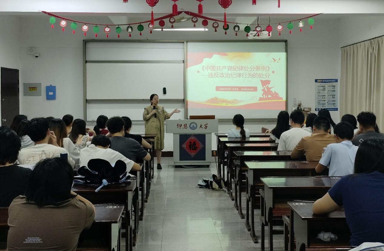 为扎实推进党纪学习教育,引导全体党员干部强化纪律意识,严守纪律规矩,2024年6月17日晚上,beat365vip官网登录入口金融系学生第一党支部在仰恩楼C2-305组织开展“《中国共产党纪律处分条例 》第六章”主题学习研讨会,针对违反政治纪律行为的处分。支部书记何丽玲老师、支部全体党员及各班入党积极分子参加了这次学习会。