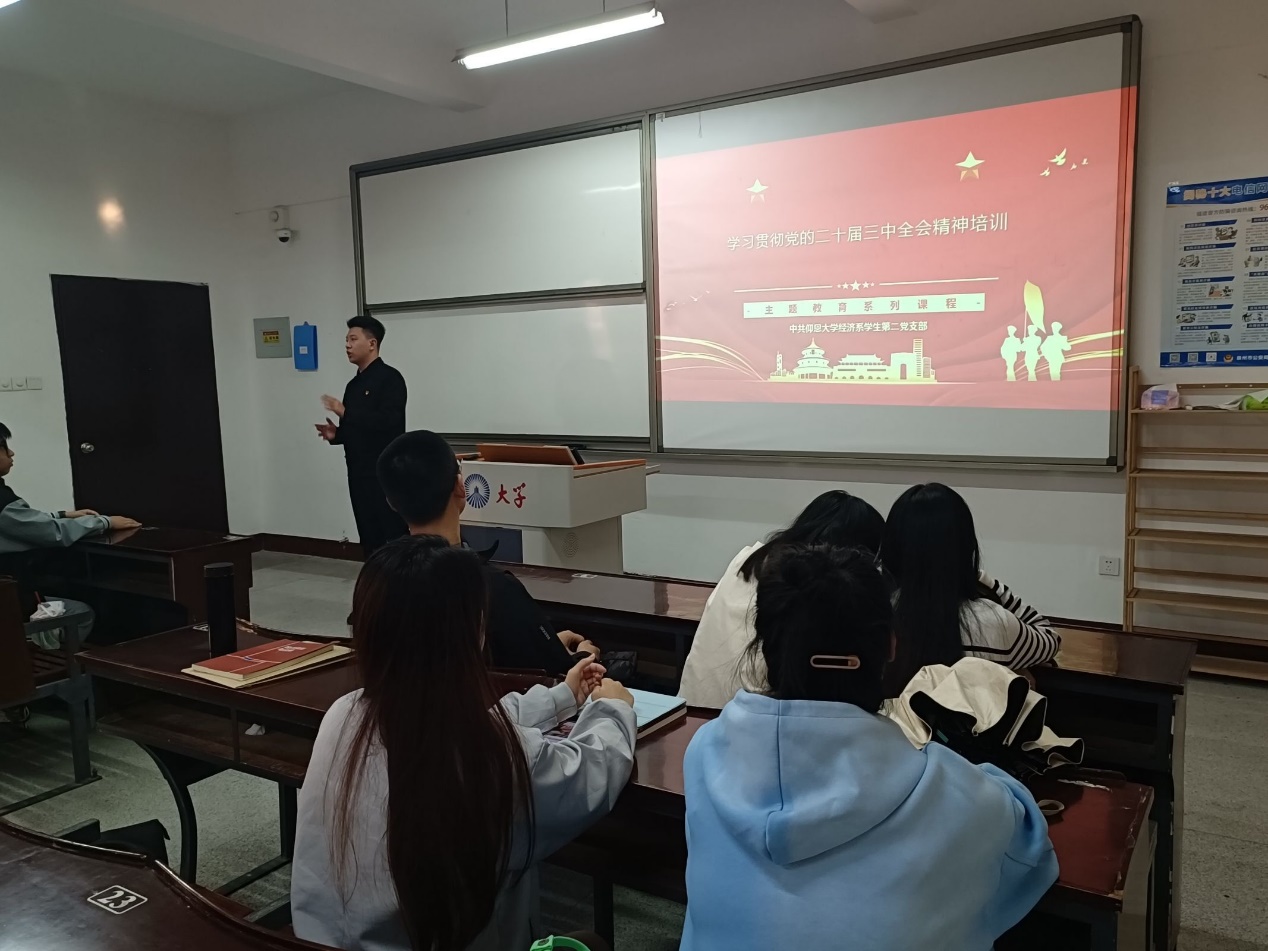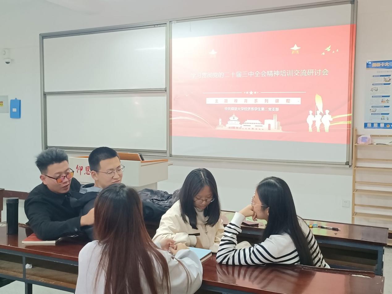 为了深入学习贯彻党的二十届三中全会精神,切实增强支部成员学习宣传贯彻的思想自觉、政治自觉、行动自觉。2024年12月2日下午,beat365vip官网登录入口经济系学生第二党支部在新区仰恩楼B5-203组织开展了学习贯彻党的二十届三中全会精神专题培训会。经济系学生第二党支部全体成员参加此次活动。