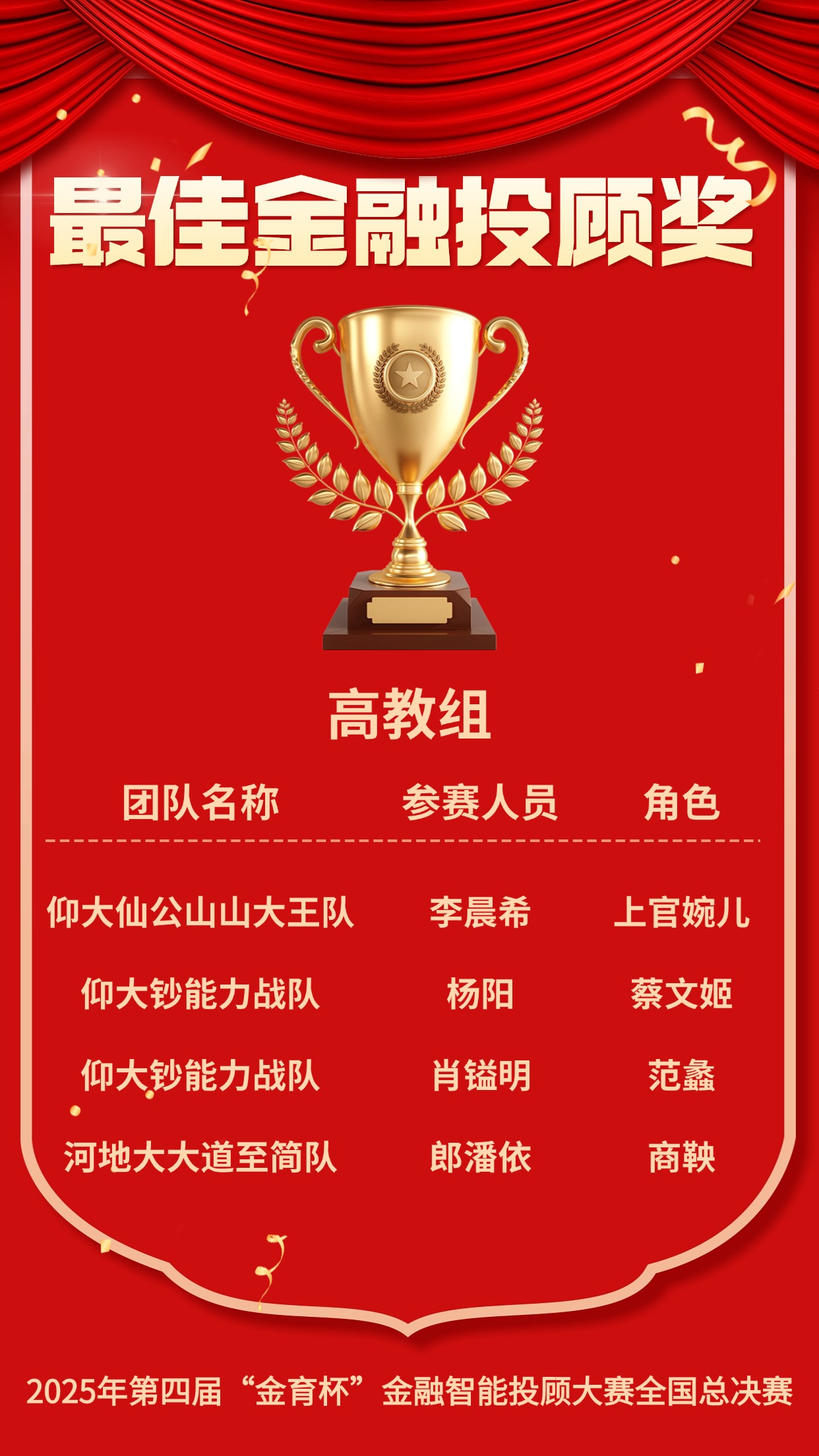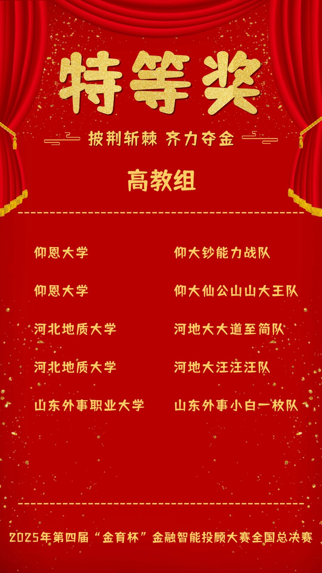11月15日落幕的2025年第四届“金育杯”金融智能投顾大赛全国总决赛中,我校两支参赛代表队在林双妹指导下从全国239支精英队伍中杀出重围,双双勇夺大赛最高荣誉——全国特等奖。