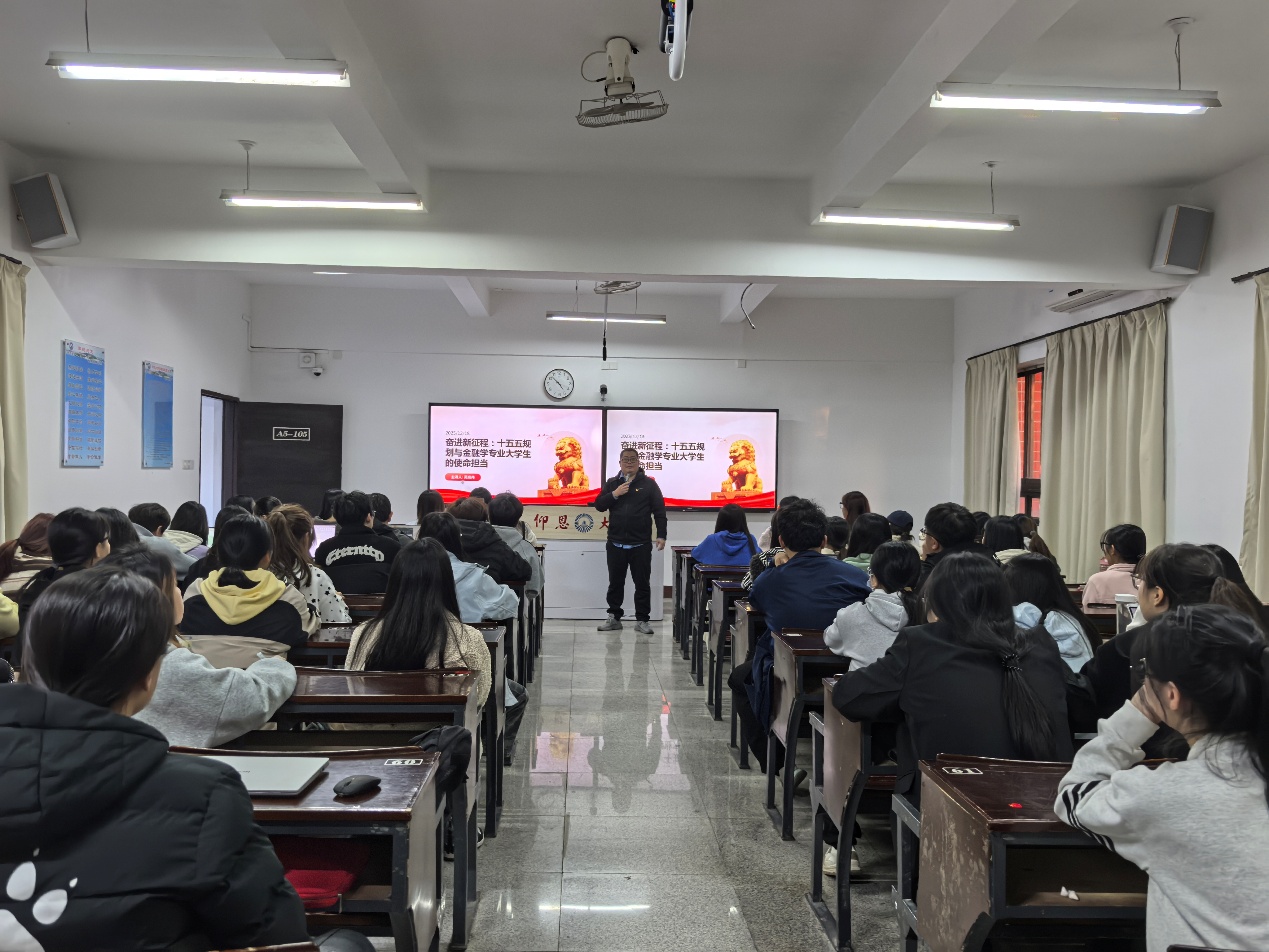 党课开篇,吴晓伟老师以“金融强国”首次写入五年规划为核心,结合金融行业发展趋势,简要解读“十五五”金融领域战略方向。他指出,“十五五”时期是基本实现社会主义现代化的关键阶段,规划中服务实体经济、推进“五篇大文章”、筑牢金融安全防线等部署,绝非遥远的政策口号,而是与同学们毕业去向、职业发展紧密相关的现实机遇。